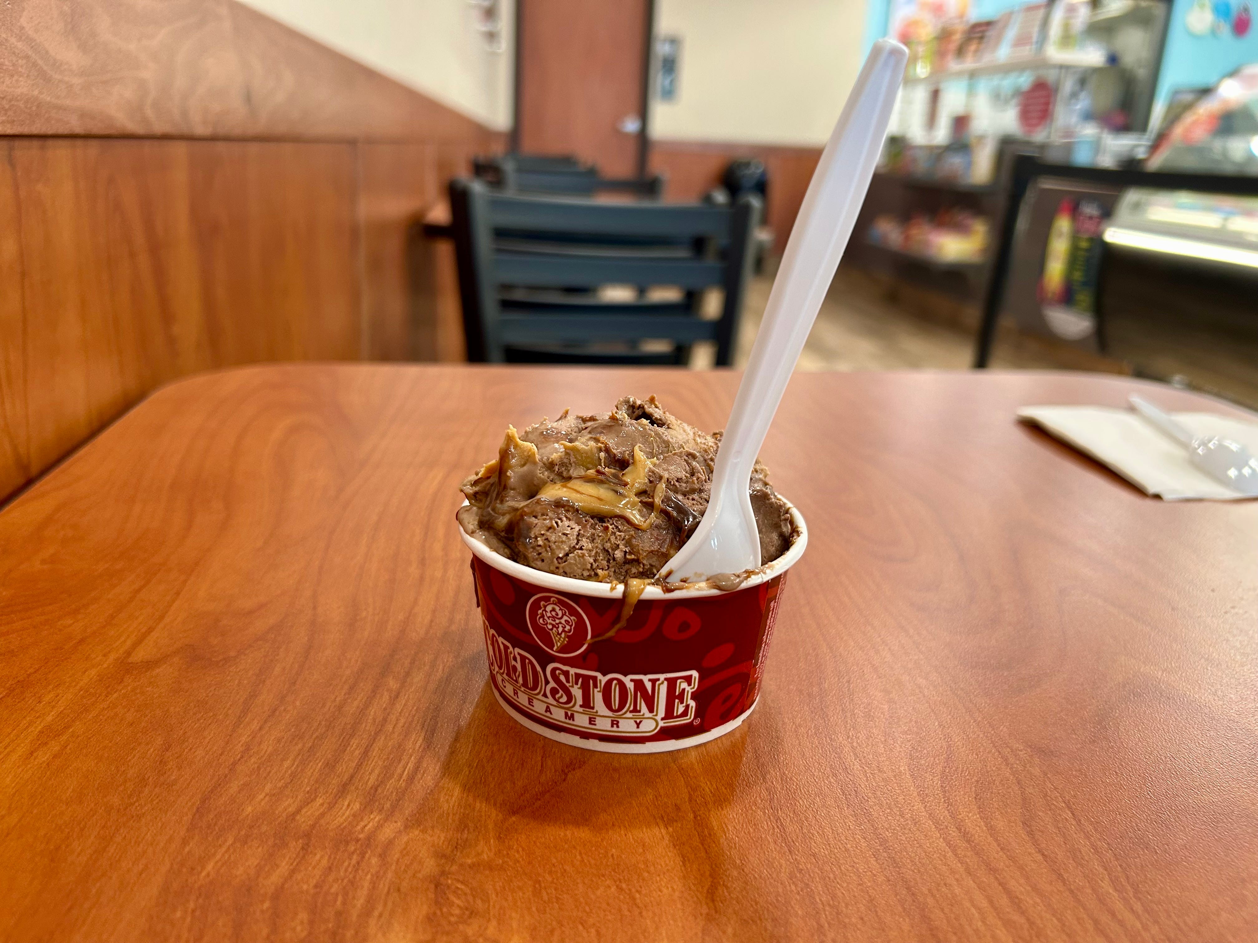 At Cold Stone, my husband and I shared a single serving (two spoons) like high school besties. It was dense and sweet and tasty, and had some shards of peanut butter cups throughout. According to the Creamery website, the ice cream is “made fresh in every store.” A glance around revealed multiple variations of ice cream made to order, including some plant-based options. There were smoothies and ice cream cakes.