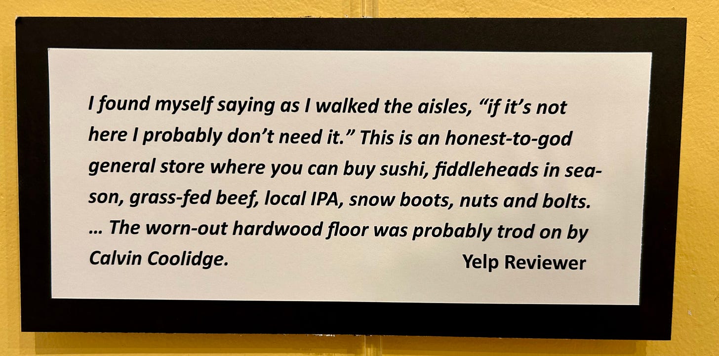 In December, 2021, CBS News aired a segment by Steve Hartman about Dan and Whit’s. I remember feverishly typing a blog post immediately after. (Click here for link.) That post turned out to be one of the most read in Artful’s history, with 8,451 views (typical is between 3500 and 4500) and 111 shares (some posts get zero shares.) Yep, we in the Upper Valley know the value of what we got. Long may Dan and Whit’s continue. And kudos to the Norwich Historical Society for such a compelling exhibition, and especially for unearthing that vintage shopping cart from the store’s basement.