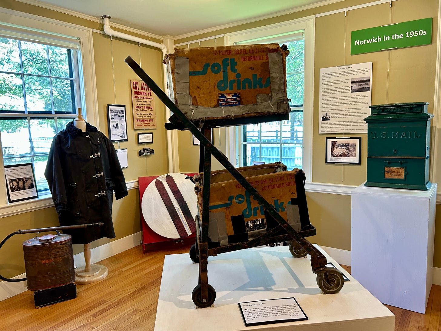 The second room is a display depicting Norwich in the 1950s, when Dan and Whit’s as we know it came to be. In early days, one didn’t browse the aisles with a shopping cart. The customer told a store employee what s/he wished to purchase and the employee dragged a cart around the store, filling it with the desired items. (See photo, top. And, you are seeing only half of the duct tape holding that thing together.)